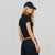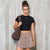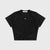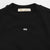 Black fitted tee featuring two printed logos, one on the front and one on the back.