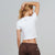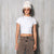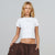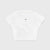 White ribbed, fitted, short t-shirt. It has one printed logo on the front and another on the back.