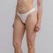 Cream-colored thong made of mesh and Lycra with an elastic waistband. It features a raised logo print on the front.