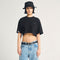 Black crop top made of cotton with a regular silhouette. It comes with a tone-on-tone banner on the right sleeve and the logo printed in raised relief at the heart point.
