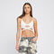 This cream top has V-shaped straps in the back, a high-density printed brown logo on the back, and a front opening at the bottom with crossed straps.