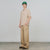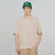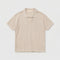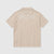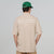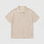 Beige knitted polo shirt with the logo embroidered on the front off to the side and a phrase from the collection embroidered on the back.