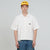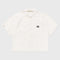 Cream-colored corduroy shirt with a boxy silhouette. It features an embroidered logo on the front pocket.