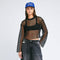 Black long-sleeve top with an oversized silhouette and mesh design. It features rustic finishes, a ribbed collar, and a banner on the right sleeve. It pairs very well with our accessories.