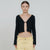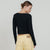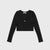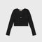 Black long-sleeved top open at the front, with a metal branded clasp in the center.
