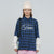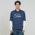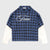 Double-sleeved plaid cotton shirt with a boxy silhouette. It features contrasting buttons and a logo print on the front.