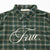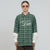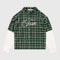 Double-sleeved plaid cotton shirt with a boxy silhouette. It features contrasting buttons and a logo print on the front.