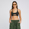 Black top with a front opening and a tonal high-density printed logo. It has an inner lining and V-shaped straps in the back.