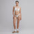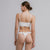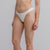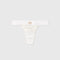 Cream-colored thong made of mesh and Lycra with an elastic waistband. It features a raised logo print on the front.