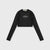 Black long-sleeved mesh crop top with rhinestone logo on the front and rhinestones all over the sleeves.