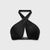 Black halter top with crisscross straps at the neck. It features the logo printed on the back in the center.